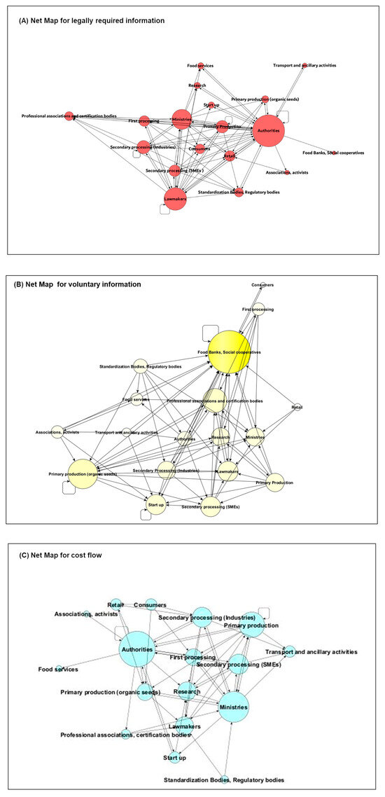 Net-Maps depicting the relationships among stakeholders of the Italian wheat supply chain contributing directly or indirectly to the definition/implementation of sustainability indicators. Arrows indicate three linkage types: (A) exchange of legally required information, (B) exchange of voluntary information, (C) cost flow. Node size indicates the stakeholder’s influence (total number of connections—degree centrality measure).
