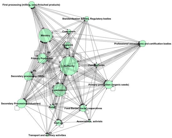 Combined Net-Map of the relationships among stakeholders of the Italian wheat supply chain contributing directly or indirectly to the definition/implementation of sustainability indicators. The map combines data obtained for the three analyzed linkage types: legally required information, voluntary information, and cost flow. Node size indicates the stakeholder’s influence (total number of connections—degree centrality measure).