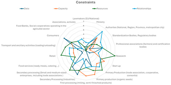 Figure 5 summarizes the participants’ opinions. The radar graph combines data obtained from the participatory workshop and the interviews. In both cases, participants considered four categories of constraints: (1) data: lack of data sources, lack of detail at the supply chain/regional level, and shortage/absence of methodologies for data processing; (2) capabilities: shortage/absence of obligations (legislative or disciplinary); (3) resources: shortage/absence of funds, human resources, time, knowledge, or experience; (4) relations: shortage/absence of contacts and non-functional/non-operational relationships. They were asked to identify and indicate up to two main constraints per stakeholder category where relevant. Each radial axis in the figure represents the number of times a given constraint was identified (as sum of contributions from individual participants) for each stakeholder category listed around the chart.