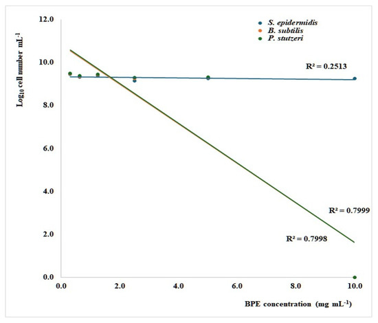 Linear regression curves indicating the relationship between the growth of Staphylococcus aureus, Bacillus subtilis, and Pseudomonas stutzeri after 24 h of culture in microdilution broth assays and the concentration of bee pollen extract (BPE). The significance of regression is 0.023 (S. aureus) and <0.001 (B. subtilis and P. stutzeri).