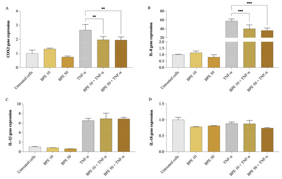 Firstly, cell viability was assessed using the MTT assay to ensure that BPE did not exert cytotoxic effects. None of the BPE concentrations up to 50 µg/mL (200 µg/mL maximum concentration tested) negatively affected A549 cell viability. Subsequently, A549 cells were pretreated for 1 h with 10 and 50 µg/mL of BPE, followed by exposure (or not) to 25 ng/mL of TNF-α for 24 h. As shown in Figure 2, exposure of A549 cells to 25 ng/mL of TNF-α resulted in a significant upregulation of inflammatory mediator gene expression, particularly, IL-8 (p < 0.001) increased 57 times, COX2 (p < 0.001) doubled, and IL-1β (p < 0.001) was 6 folds higher, compared to untreated cells. However, no change was observed in IL-18 gene expression. Pretreatment with BPE at both concentrations significantly reduced the IL-8 and COX2 expression, while no significant effect was observed on IL-1β expression. Precisely, BPE 50 caused COX2 expression to go down by 26.7%, while that of IL-8 by 37.2%.