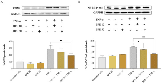 At the protein level, the effect of BPE on A549 inflamed cells was confirmed by monitoring the expression of COX2 and phospho–NF-κB p65 proteins by Western blotting. Compared to the control, TNF-α-inflamed cells showed a significant 3-fold increase in COX2 (Figure 3A) and 2-fold increase in phospho–NF-κB p65 (Figure 3B) proteins. However, the treatment with BPE 50 downregulated COX2 protein levels by 32.9% in TNF-α-stimulated A549 cells. According to the study by Lopes and colleagues [44], a bee pollen hydroalcoholic extract could also inhibit the activity of COX1 and COX2 isolated enzymes by 86 and 91%, respectively, at 50 µg/mL concentration.