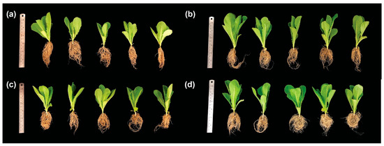 Growth of lettuce from (a) soil without microalgal-based biofertilizer, (b) soil treated with biomass, (c) soil treated with DMB, and (d) soil treated with DAEMB.