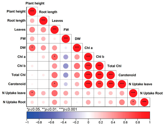 Plant growth parameters, including shoot length, root length, fresh weight, dry weight, and the number of leaves, were evaluated. Chlorophyll a, chlorophyll b, total chlorophyll, and carotenoid content were measured according to the method of Arnon [15].
