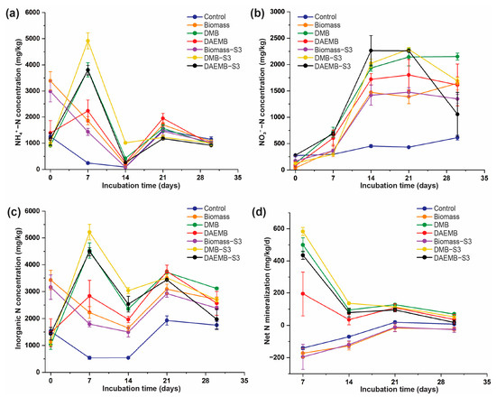 The net nitrogen (N) mineralization rates for the biomass and biomass-S3 treatments exhibited negative values throughout the incubation period. These rates increased from −171.99 to −16.15 mg/kg·d and from −195.58 to −11.26 mg/kg·d, respectively, between the initial day and the 21st day of incubation. However, by the 30th day, the rates decreased to −24.05 and −26.06 mg/kg·d, respectively, following a trend similar to that observed in the control treatment. In contrast, the net N mineralization rates for the DMB, DAEMB and DAEMB-S3 treatments demonstrated a serrated pattern. Initially, these rates ranged from 194.84 to 499.99 mg/kg·d but declined to 35.26–94.78 mg/kg·d by the 14th day of incubation. Subsequently, the rates increased to 95.11–127.77 mg/kg·d by the 21st day, before decreasing again to 17.87–69.49 mg/kg·d by the end of the incubation period. The DMB-S3 treatment showed a distinct pattern, with net N mineralization rates continuously decreasing from 583.43 mg/kg·d at the start to 52.20 mg/kg·d by the end of the incubation period.