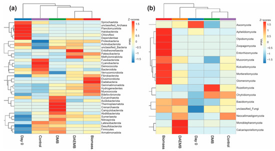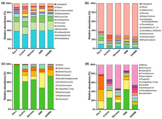 In the present study, the soil treated with different sequences of treatments exhibited bacterial operational taxonomic units (OTUs) of 2946, 2179, 2121, 2088, and 2150 for Day 0, control, biomass, DMB, and DAEMB treatments, respectively. The abundance and diversity of bacterial community alpha diversity were evaluated using established biodiversity indices. The ACE and Chao indices were employed to quantify bacterial abundance, while the Shannon and Simpson indices were used to assess bacterial diversity. As shown in Table 4, the ACE, Chao1, Shannon, and Simpson indices exhibited similar patterns, suggesting that microalgal-based biofertilizer may not have a significant effect on the unity of the bacterial community in the soil. Similar results have been reported in previous studies. For example, Tan et al. [67] reported that organic fertilizer did not improve the microbial community but did increase lettuce biomass. Moreover, Zhang et al. [68] also found that inoculant compost of YM1 as a biofertilizer did not significantly improve microbial community but did increase lettuce plant growth. However, in terms of fungal communities, the number of OTUs was 457, 977, 1504, 731, and 1114 for Day 0, control, biomass, DMB, and DAEMB, respectively. The application of microalgal-based biofertilizers, particularly the biomass and DAEMB treatments, increased the number of fungal OTUs in the rhizosphere. Among the treatments, the biomass treatment exhibited the highest ACE and Chao index values, while DMB had the lowest values compared to DAEMB and the control. A similar trend was observed for the Shannon and Simpson indices, with the biomass treatment showing the highest value and DMB the lowest. These findings indicate that the fungi community may have a strong impact on the growth of lettuce. The fungal community structure changed as a result of the nutrients in the microalgal-based biofertilizer. Several studies have reported that rhizosphere fungal activities significantly influence plant growth, nutrient assimilation, and soil health [69]. The plant growth-promoting effects of rhizosphere fungi have been demonstrated in tomatoes, strawberries, and lettuce [68,70,71]. Additionally, rhizosphere fungi establish a connection between soil and plant roots [72]. Rhizosphere fungi are typically involved in the decomposition of soil organic matter and the release of nutrients, thereby promoting crop growth [73]. In this context, the microalgal-based biofertilizer might influence the fungal rhizosphere through nutrient availability and release rates. The higher abundance and diversity of the fungal community observed in biomass and DAEMB treatments indicate that these treatments contain higher nutrient content and release nutrients more rapidly, enhancing fungal abundance and activity to promote rapid growth [68]. Conversely, the lower abundance and diversity of the fungal community observed in the DMB treatment might be due to its slower nutrient release, which still affects fungal communities but at a slower pace. Additionally, since DMB is obtained after the lipid extraction process, it might retain some chemical residues that could impact the fungal community [74].