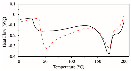 DSC curves of dehydrated beetroot sample at the beginning of storage (red dashed line) and after 6 months of storage at room temperature (solid line).