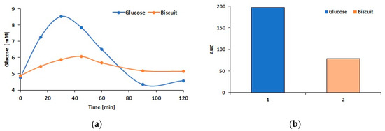 Postprandial glucose concentration dependence curve (OGTT) after consuming 25.0 g of pure glucose and an amount of biscuits with 20% BP containing 25.0 g of available carbohydrates (a); Areas under the time dependent curves of blood glucose concentration (AUC) after consumption of glucose and biscuits (b).