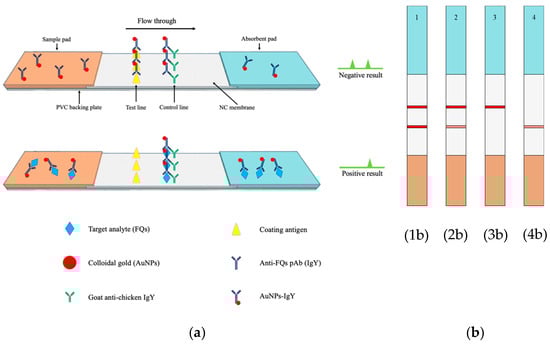 Schematic diagram of the LFIA for detecting FQs by using IgY antibody. (a) The structure of LFIA test strip, (b) LFIA scheme test result, (1b) negative result, (2b) weak positive result, (3b) positive result, and (4b) invalid result.