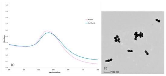 The purified IgY antibody proved completely pure and intact. The anti-FQs IgY concentration was 11 mg/mL. The titer of the antibody as determined by ELISA was as elevated as 1:128,000. The analysis of the morphology and dimensions of the AuNPs is significant in assessing the stability of colloidal gold. To ensure the effective conjugation of the antibody and the colloidal gold, the AuNPs–antibody complexes were analyzed using UV-visible spectroscopy. A red shift in the maximum absorption wavelength was observed compared to the bare colloidal gold nanoparticles. An antibody protein surrounding the tagged gold particles was also detected. UV-visible spectroscopy was employed to scan the AuNPs within the 400 to 700 nm wavelength range. A single peak of maximal absorbance was obtained at a wavelength of 534 and 532 nm for AuNPs and AuNPs-labeled IgY pAb, respectively (Figure 3a). In addition, the average particle size of AuNPs was less than 100 nm, as indicated by the transmission electron microscopy (TEM) characterization in Figure 3b. The interaction between AuNPs and antibodies was typically attributed to electrostatic attraction. Under specific circumstances, AuNPs have a negative surface charge, while antibodies possess a positive surface charge [12].