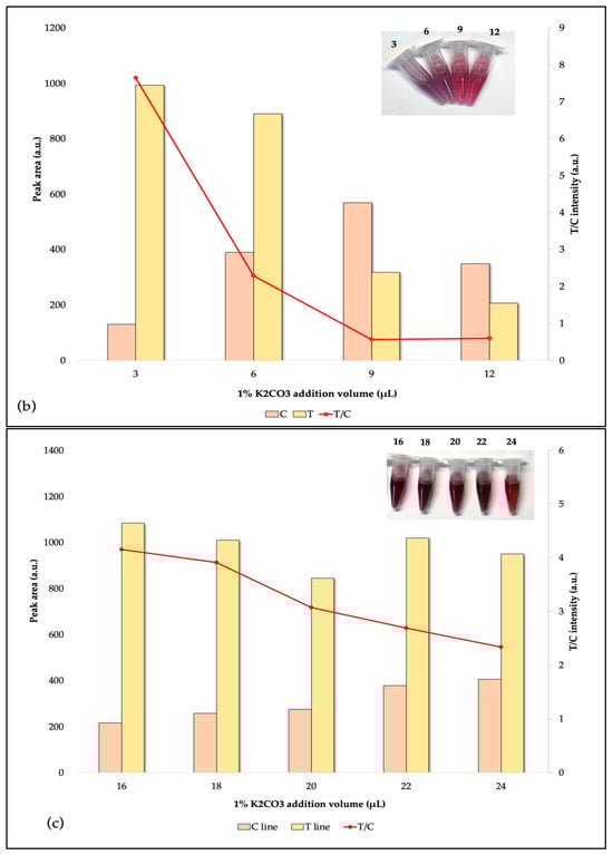 The pH reaction levels were crucial to the effectiveness of AuNPs–Abs conjugates. Theoretically, the pH of the reaction is supposed to be moderately elevated over the isoelectric point of protein. Below the isoelectric point, antibodies may clump together, causing AuNPs–Abs to clump together and precipitate. This would lower the accuracy and cause false negatives. Above the isoelectric point, the adsorption action is limited by charge repulsion between the AuNPs and the antibodies. This makes the test strip lighter in color. Based on signal intensity and sensitivity (Figure 4), the best pH for the AuNPs solutions was 7.8, which was reached by adding 9 µL of 0.1 M K2CO3 solution. The dimensions and concentration of AuNPs also influence the interaction between the antibody and the target analyte under investigation. According to the findings of the tests, the suitable concentration of AuNPs was 2:10,000.