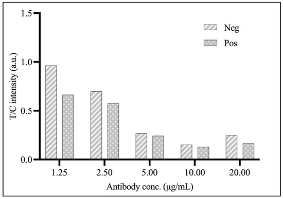 The results shown in Table 3 demonstrate that the suppression of the antibody to the test substance is less than 1.00 percent inhibition when coated antigen concentrations are more than 0.50 mg/mL. Therefore, coating antigen concentrations of 0.5 and 0.25 are appropriate for the reaction on the strip test. In addition, it is worth noting that the optimal antibody concentration for usage as a probe is 1.25 µg/mL, which shows the most significant difference in T/C values in negative and positive results, as shown in Figure 5.