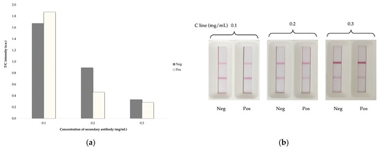 The optimization of secondary antibody concentration (C line) for LFIA strip: (a) the T/C response value and (b) the LFIA test strip image.