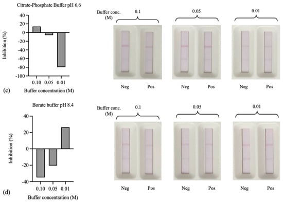 The optimization results of the buffer solution dissolved AuNPs-IgY probe for the LFIA test strip: (a) phosphate buffer pH 7.4, (b) phosphate buffer saline pH 7.4, (c) citrate–phosphate buffer pH 6.6, and (d) borate buffer pH 8.4.
