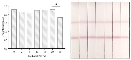 However, Figure 8 shows a significant (p < 0.001) decrease in the T/C value when the methanol concentration reached 30%. This means that when the amount of methanol increases, it might start to get in the way of the binding interactions between the AuNP-IgY probe and the target, or it might make the colloidal gold–antibody conjugate a little less stable. Therefore, we should ideally keep methanol concentrations at or below 20% for the optimal performance and stability of the AuNPs-IgY antibody probe.