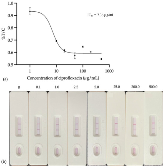 Inhibition curve of ciprofloxacin by LFIA strip test: (a) standard curve and (b) inhibition strip test.