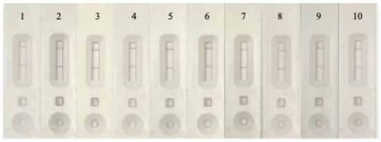 The AuNPs-IgY solution was combined with 100 μL of sample extraction buffer solution, thoroughly mixed with a pipette, and incubated for 10 min at room temperature, as depicted in the diagram. Then, 100 μL of the solution mixture was added to the well of the strip test. The mixture was transported from the sample pad to the absorbent pad. This transfer occurred due to the interaction between the antigen coated on the T line and the goat anti-chicken IgY on the C line, which is basically the principle of the antibody–antigen reaction. Subsequently, the detection results were visible to the naked eye after 20 min.