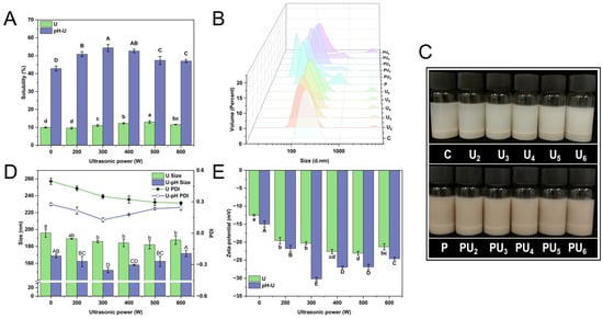 (A) solubility, (B) droplet distribution, (C) appearance, (D) mean particle size and polydispersity index (PDI), and (E) zeta potential of native (C) and treated PP with high-intensity ultrasound (HIU, 200–600 W) and pH-shifting (pH 12), individually (U2, U3, U4, U5, U6, and P) or in combination (PU2, PU3, PU4, PU5, and PU6). U and U-pH represent HIU treatment alone and the combined treatment of HIU and pH-shifting, respectively. Different upper (A–E) and lower (a–d) case letters denote marked differences in the solubility, size, and zeta potential of PP with HIU individual and pH-shifting and HIU combined treatment, respectively (p < 0.05).