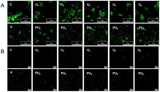 Confocal laser scanning microscopy (CLSM) micrographs of (A) the suspensions and (B) the supernatant of native (C) and treated PP with high-intensity ultrasound (HIU, 200–600 W) and pH-shifting (pH 12), individually (U2, U3, U4, U5, U6, and P) or in combination (PU2, PU3, PU4, PU5, and PU6).
