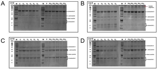 Sodium dodecyl sulfate-polyacrylamide gel electrophoresis (SDS-PAGE) pattern of (A,C) solutions and (B,D) supernatants for native (C) and treated PP with high-intensity ultrasound (HIU, 200–600 W) and pH-shifting (pH 12), alone (U2, U3, U4, U5, U6, and P) or in combination (PU2, PU3, PU4, PU5, and PU6) under (A,B) nonreducing and (C,D) reducing conditions. M indicates the marker.