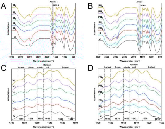 Building on our evidence suggesting that the structure of PP may have undergone alterations during the combined pH-shifting and HIU treatment, our immediate focus was on validating the impact of individual and combined treatments on the PP structure. FTIR spectroscopy is a reliable tool for analyzing molecular composition, structure, and intermolecular interactions, offering valuable insights into the secondary structure of proteins [53]. From Figure 4A,B, there were minimal changes in the FTIR spectra of PP after various treatments, suggesting the absence of notable alterations in the protein polypeptide backbone.