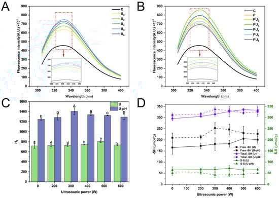 (A,B) intrinsic emission fluorescence spectra, (C) surface hydrophobicity (H0), and (D) sulfhydryl groups (-SH) and disulfide bonds (S-S) of native (C) and treated PP with high-intensity ultrasound (HIU, 200~600 W) and pH-shifting (pH 12), individually (U2, U3, U4, U5, U6, and P) or in combination (PU2, PU3, PU4, PU5, and PU6). U and U-pH represent HIU treatment alone and the combined treatment of HIU and pH-shifting, respectively. Different upper (A–E) and lower (a–e) case letters denote marked differences in the H0 of PP with HIU treatment alone and with a combination of pH-shifting and HIU, respectively (p < 0.05).