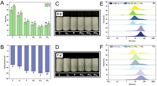 (A) Mean particle size, (B) zeta potential, (C,D) appearance, and (E,F) particle size distribution of fresh and 7-day-stored (D) emulsions stabilized by native (C) and treated PP with high-intensity ultrasound (HIU, 200–600 W) and pH-shifting (pH 12), individually (U3 and P) or in combination (PU2, PU3, and PU4). Different upper (A–E) and lower (a–e) case letters denote marked differences in the size and zeta potential of varying treatments, respectively (p < 0.05).