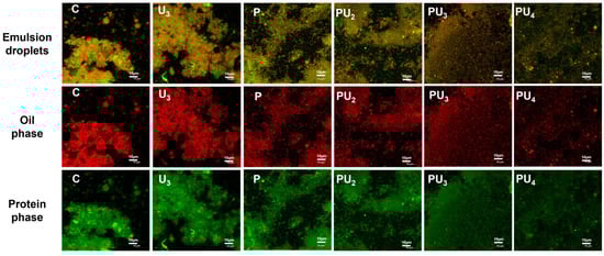 CLSM was used to inspect the emulsion’s microstructure, thereby facilitating the observation of the distribution of oil droplets and proteins within the emulsion. From Figure 7, it can be observed that the oil droplets in the control emulsion are relatively larger and mostly exhibit an irregular spherical shape. This could be ascribed to the rigid structure of native protein aggregates, which possess poor surface characteristics, leading to slow diffusion rates and weak affinity for the oil–water interface [83]. Additionally, it can be observed from the images that although the control emulsion’s protein coats the oil droplets, the resulting interfacial film is discontinuous and non-uniform, with some droplets not being fully surrounded by the protein. Thus, we hypothesize that the instability of emulsions prepared with native PP is due to the variable size of oil droplets and the extent of protein aggregation, which together prevent the formation of a homogeneous and continuous oil-in-water structure. Similarly, Yang et al. [16] have proposed that the aggregation of EYP particles induces a non-uniform interfacial film on emulsion droplets, which in turn leads to a reduction in the film’s mechanical robustness and an increased likelihood of emulsion destabilization, characterized by enlarged droplet sizes. As observed in Figure 7, individual treatment with HIU or pH-shifting leads to a reduction in droplet size and a more homogeneous distribution. The combined treatment, PU3, which contrasts with the samples treated with HIU or pH-shifting individually, yields a diminished droplet size and fosters a more uniform dispersion. Concurrently, as evidenced by the protein phase image, the protein aggregates in PU3 are well-dispersed, allowing for homogeneous adsorption at the oil–water interface, which is more conducive to emulsion stability.