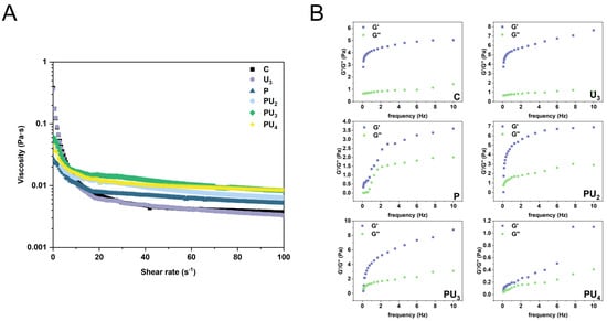 Rheological properties are crucial indicators of emulsion performance and significantly influence emulsion stability. As shown in Figure 8A, the apparent viscosity of all samples sharply decreases as the shear rate increases, indicating shear-thinning behavior. This result may be attributed to the gradual stretching, deformation, or disintegration and rearrangement of emulsion structures under shear stress [87]. Alternatively, an increase in shear rate may lead to flocculation within the emulsion system, reducing the dispersive resistance between droplets, which in turn leads to a decrease in viscosity [88]. Emulsions prepared from PP treated with pH-shifting alone (P) exhibit higher apparent viscosity compared to those treated with HIU alone (U3) due to the stronger effect of pH-shifting on PP, which exposes more hydrophobic groups (Figure 5C), thereby improving interfacial properties. The emulsion prepared from combined-treated PP (PU3) exhibited the highest apparent viscosity among all samples. This is attributed to its smallest droplet size and most uniform distribution (Figure 7), which reduce droplet collision frequency and enhance emulsion stability, as supported by classical colloidal theory [89,90]. In accordance with Stokes’ law, an increase in the viscosity of the emulsion leads to a decrease in the droplet settling or floating rate, thereby enhancing the stability of the emulsion [91].