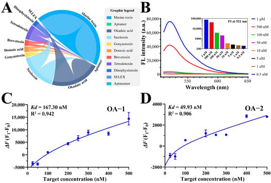 A literature overview of the marine toxin aptamers and fluorescence characteristics of the selected aptamers. (A) The publications (through 2022) featured the theme of marine toxin aptamers and were obtained from Web of Science (WoS). (B) The fluorescence intensity corresponded to different FAM-OA-1 sequence concentrations. The inset in (B) shows the fluorescence intensity at 521 nm for various concentrations, with the Y-axis presented on a logarithmic scale (base 10). (C,D) Kd estimation for aptamers binding with individual targets based on FRET measurements for OA-1 and OA-2, respectively.