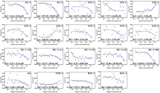 MST measurement results of the 19 toxin aptamer sequences, showing the binding curves of each toxin-aptamer interaction. The upper right corner lists the corresponding aptamer IDs for each marine toxin, while the lower left corner presents the dissociation constants (Kd) for the interactions.
