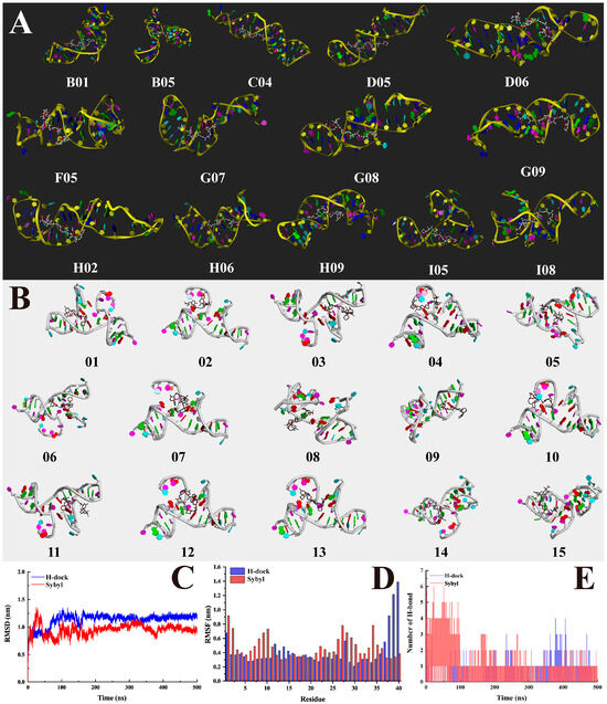 Comparison of the simulated docking results using two different prediction methods. (A) The docking simulation modes between OA-2 and OA molecules with CScores ≥ 5.0 according to SYBYL-X. (B) The top 15 docking simulation modes between OA-2 and OA molecules according to H-dock. (C) The RMSD of the aptamer–target complex over 500 ns for the MD simulations. (D) The RMSF of residues in the OA-2 for the MD simulations. (E) The time-resolved hydrogen bonding analysis between the aptamer and target.