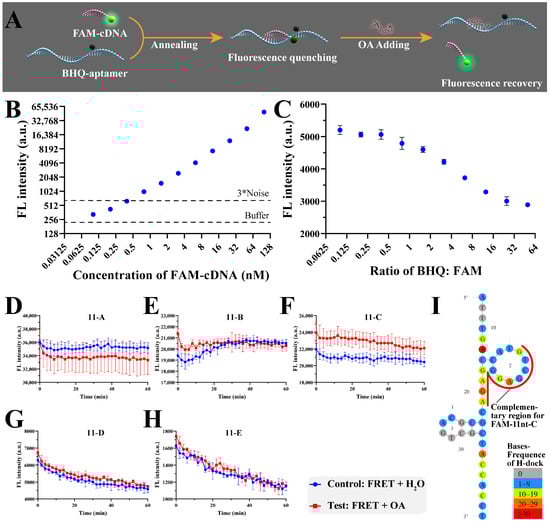 Validation of recognition site localization using the FRET method. (A) A schematic diagram of duplexed-FRET complex designing to determine the binding sites of OA-2. (B) Concentration optimization of FAM-11nt-n via FI measurement. (C) Ratio optimization of FAM-11nt-n and APT-mid-BHQ1 via FI measurement. (D–H) Fluorescence change in duplexed-FRET complexes in 1 h after OA addition. (I) A comparison of the complementary region for FAM-11nt-C and binding sites predicted by H-dock.