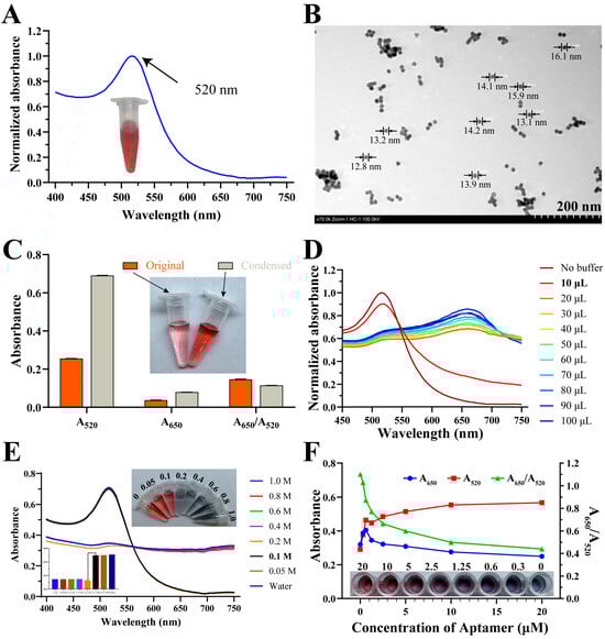 Optimization of aptamer–AuNP colorimetric assay. (A) UV-vis absorption spectra of AuNPs. (B) TEM characterization of AuNPs. (C) Changes in AuNPs before and after centrifugation. (D) Volume optimization of BB addition. (E) Concentration optimization of NaCl addition with corresponding solution image. Inset graph on left shows fluorescence intensity at 520 nm for various concentrations. (F) Concentration optimization of aptamer determined by measuring absorbance with corresponding solution image.