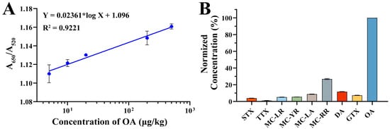 Methodological characterization for aptasensor. (A) Relationship between A650/A520 of proposed aptasensor and OA concentration in shellfish samples. (B) Normalized data of this aptasensor with different toxins in same concentration (i.e., STX, TTX, MC-LR, MC-YR, MC-LA, MC-RR, DA, GTX, and OA).