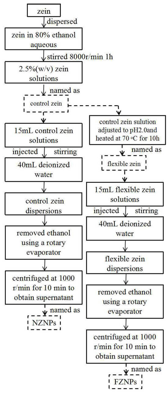 Nanoparticles were prepared using anti-solvent precipitation method [5]. Briefly, approximately 15 mL of the control and flexible zein stock solutions were slowly injected (using a syringe) into 40 mL of deionized water over 2 min under continuous magnetic stirring at 4000 rpm for 30 min to form dispersions. Subsequently, the residual ethanol in the particle dispersions was removed using a rotary evaporator (N1001, Shanghai Ailang Instrument Co., Ltd., Shanghai, China) at 45 °C. The resulting zein nanoparticle dispersions were then centrifuged at 1000 r/min for 10 min to obtain the supernatant. Finally, the nanoparticle dispersions were freeze-dried for 48 h using a freeze dryer (FDU-2110, Tokyo Physical and Chemical Equipment Co., Ltd., Tokyo, Japan). The nanoparticles derived from the control zein and flexible zein were designated as NZNPs and FZNPs, respectively. A schematic diagram of the sample preparation process was shown in Figure 1.