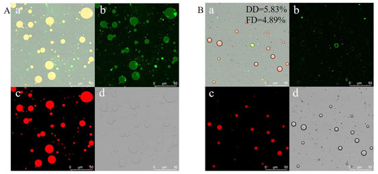 Figure 2. CLSM images of the emulsions stabilized by the control zein (A) and flexible zein (B). Corn oil was stained with Nile Red (c), control zein and flexible zein were stained with Nile Blue (b), overlapping drawing (a) and bright field (d).