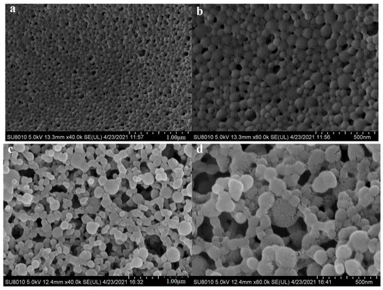 The morphology of NZNPs and FZNPs was examined using SEM at magnification of 40.0 k and 80.0 k, as depicted in Figure 3. The NZNPs exhibited a uniform and regular distribution (Figure 3a), maintaining a compact structure even at higher magnification (Figure 3b). In contrast, the FZNPs displayed a less regular distribution (Figure 3c), with some particles appearing fragmented (Figure 3d). Song et al. [31] noted that the addition of glutamic acid to zein altered the size, shape, and distribution of zein particles by promoting intermolecular aggregation. In this study, flexible zein was prepared under acidic conditions without subsequent neutralization to minimize the introduction of additional ions. The pH of the environment played a critical role in influencing the interaction among flexible zein molecules. Yu et al. [1] demonstrated that acidic deamidation converts glutamine to glutamic acid, increasing the surface hydrophobicity of zein, and enhancing the intermolecular interactions. This process, however, reduces the stability of zein particles, leading to their aggregation into microspheres. Similar results had also been reported by Cabra et al. [16]. Additionally, the higher relative hydration of zein under acidic conditions contributes to the formation of larger, more diffuse structures observed in electron microscopy. The distinct morphological differences between NZNPs and FZNPs can be attributed to changes in molecular structure, electrostatic properties and acidic conditions resulting from the modification process.