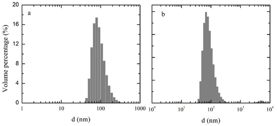 Figure 4. Volume distribution percentage of the NZNPs (a) and FZNPs (b).
