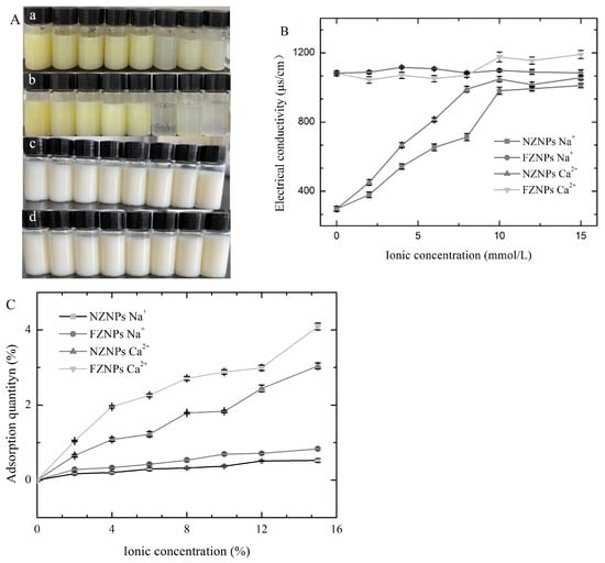 Calcium ions (Ca2+) and sodium ions (Na+) are essential for various biological functions and are widely present in both food and animal tissues. To explore the adaptability of FZNPs, solutions of NaCl and CaCl2 at different concentrations (0, 2, 4, 6, 8, 10, 12, 15 mmol/L) were prepared. Both NZNPs and FZNPs were added to these solutions and their behavior was assessed through visual observations and electrical conductivity measurements (Figure 5). The NZNPs solutions appeared yellow due to the presence of xanthophyll (Figure 5A(a,b)), which are strongly associated with hydrophobic proteins and coextracted with zein [3]. In contrast, FZNPs solutions were milky white (Figure 5A(c,d)) because the acidic and thermal treatment used to modify zein destroyed the xanthophylls. As the concentrations of NaCl and CaCl2 increased from 0 to 8 mmol/L, the NZNPs solutions remained yellow and transparent (Figure 5A(a,b)). However, when the concentrations of NaCl and CaCl2 were further increased from 10 to 15 mmol/L, the solutions became more transparent due to partial precipitation of zein nanoparticles (Figure 5A(c,d)). This indicated that NZNPs did not dissolve well at those ion concentrations and became less stable as suspensions with increasing ionic strength. The transparency of NZNPs increased at higher concentrations of sodium chloride and calcium chloride, with NZNPs showing greater transparency in 10–15 mmol/L CaCl2 than in 10–15 mmol/L NaCl. This suggested that CaCl2 destabilized NZNPs more than NaCl at high concentrations. In contrast, FZNPs solutions remained milky white across the entire range of 0–15 mmol/L CaCl2 and NaCl, indicating different sensitivities of NZNPs and FZNPs to calcium and sodium ions.