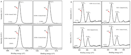 The surface levels of Ca2+ and Na+ on FZNPs and NZNPs were analyzed using XPS. The NZNPs were treated with 6 mmol/L and 12 mmol/L CaCl2 and NaCl solutions. The peak area for each element (Ca2+ or Na+) was obtained using Origin8.0 software, which reflects the quantity of the element associated with the nanoparticles. The relative amounts of bound elements were compared based on their peak area [23].