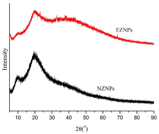 The crystal state and diffraction characteristics of NZNPs and FZNPs were examined using XRD patterns. As shown in Figure 7, the diffraction angles (2θ) of NZNPs are 9.6° and 19.3°, respectively. Wei et al. [35] also reported that the individual zein had relatively flat peaks, indicating the amorphous nature of zein. These peaks are relatively broad and flat, lacking sharp characteristic peaks, which is indicative of an amorphous structure. The finding is consistent with the results of Hu et al. [24]. In contrast, the diffraction angles of FZNPs in this study are slightly shifted to 9.9° and 19.7°, indicating that the structure has been altered.