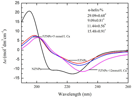 Figure 8. Stacked far−UV CD spectra of NZNPs and FZNPs. The inserted image represents the α−helix content, expressed as means ± standard deviation (SD) of triplicate analyses. Different superscript letters within the same column denote statistically significant differences (p < 0.05).