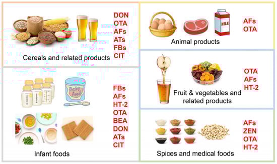 Although the level of mycotoxin contamination varies considerably between regions, the types of contaminants can be classified according to food categories. In cereals and cereal products, maize is mainly contaminated with AFBs, FB1, FB2, FB3, T-2, HT-2, NIV, DON, ZENs, ATs, CIT, and BEA; rice is mainly contaminated with ZEN; wheat is mainly contaminated with T-2, HT-2, DON, NIV, ZEN, CIT, FB2, OTA, ATs, ENNs, and BEA [17]; barley is mainly contaminated with DON, NIV, ZEN, HT-2, AFG2, T-2, and OTA; oats are mainly contaminated with DONs, NIV, ZEN, T-2; rye is mainly contaminated with DON, NIV, HT-2; millet is mainly contaminated with FB1, FB2, DONs, ZENs, HT-2, and ATs; sorghum is mainly contaminated with FBs, DONs, and ZENs. Of the global crop supply, an estimated 60–80% of crops are contaminated with mycotoxins, with 20% exceeding the European Union (EU) legal food safety limits [18].