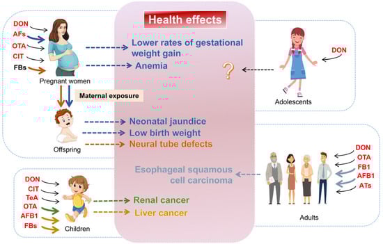 Exposure and health effects of mycotoxins in different populations. The mycotoxin name letters in red indicate toxins whose exposure levels exceed the safety threshold. Bold colored arrows indicate exposure scenarios that have been reported to cause negative health effects; dotted arrows indicate that exposure to toxins with arrows of the same color is associated with the occurrence of this health effect.