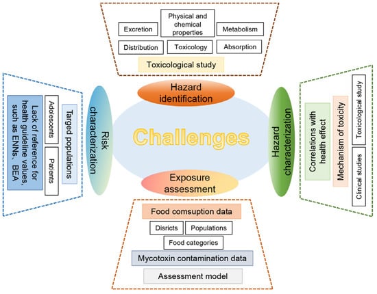 Risk assessment of mycotoxins using HBM of biological samples like serum and urine provides a more intuitive understanding of the extent of human mycotoxin exposure. In the studies of recent years, mycotoxins have been prevalent in all types of biological samples and pose varying degrees of health risk in different populations, with more data from developed countries regarding child and adult populations. In particular, it can be found that infants and young children are at a higher risk of mycotoxin exposure. However, for the HBM of this population, data are scarcer, which should be a concern for future research. Meanwhile, these studies highlight the necessity for more in vivo toxicological studies to provide a better basis for further comprehensive risk assessments, especially for some emerging mycotoxins. Despite growing research on mycotoxin exposure risks, there are still many gaps and challenges in current related research (Figure 3). Regarding hazard identification, for some emerging toxins, there is still a lack of comprehensive technical information analysis support from authorities. Toxicological studies covering aspects such as basic toxicology, physical and chemical properties, absorption and metabolism regulation, toxicokinetics, and tissue distribution are required. These studies should be carried out in line with the guidelines recommended by international organizations or relevant national standards. For hazard characterization, specific toxicity and health hazards to humans of toxins need to be illustrated by toxicological and clinical studies. For exposure assessment, there is currently a lack of data on a significant portion of food consumption of key populations such as pregnant women, infants, and specific patient populations, which needs to be further explored.