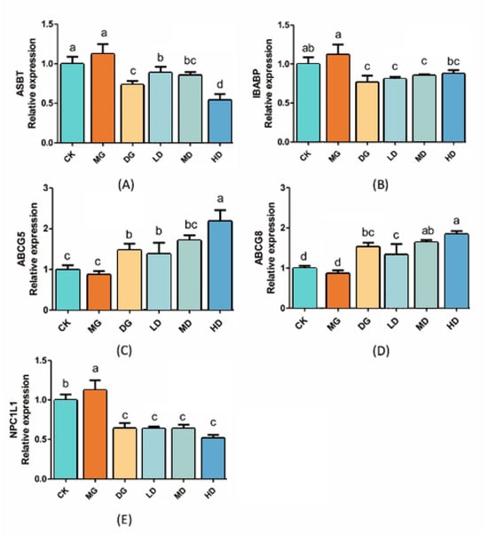 - Hoang, M.H.; Houng, S.J.; Jun, H.J.; Lee, J.H.; Choi, J.W.; Kim, S.H.; Kim, Y.R.; Lee, S.J. Barley intake induces bile acid excretion by reduced expression of intestinal ASBT and NPC1L1 in C57BL/6J mice. J. Agric. Food Chem. 2011, 59, 6798–6805. [Google Scholar] [CrossRef]