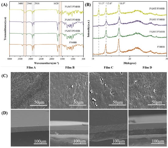 The micromorphology of the films is shown in Figure 1C,D. As the melatonin increases, the surface topography of the material transitions from rough to smooth. This transition suggests a degree of compatibility between melatonin and P34HB, as increased interfacial interactions result in a smoother and more uniform surface. In particular, this interfacial compatibility appeared to increase with higher melatonin content, leading to changes in the film’s structure.