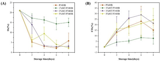Changes in the concentrations of O2 (A) and CO2 (B) within the packaging bag during storage.
