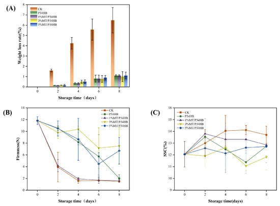 As shown in Figure 3A, the weight loss rate increased across all groups during the 8-day storage period. The control group (CK) experienced the highest weight loss of 7.8%. In contrast, peaches packaged with P34HB film showed minimal weight loss, with each group losing only about 1% of their weight over the same period. The minor differences in weight loss among the groups treated with different melatonin concentrations suggest that melatonin’s effect on water retention remains relatively consistent across a certain concentration range, without a significant synergistic effect. Additionally, the primary factor controlling the weight loss rate in fruits and vegetables is the barrier properties of the packaging film. It has been reported that proper barrier packaging can effectively control fruit weight loss [39].